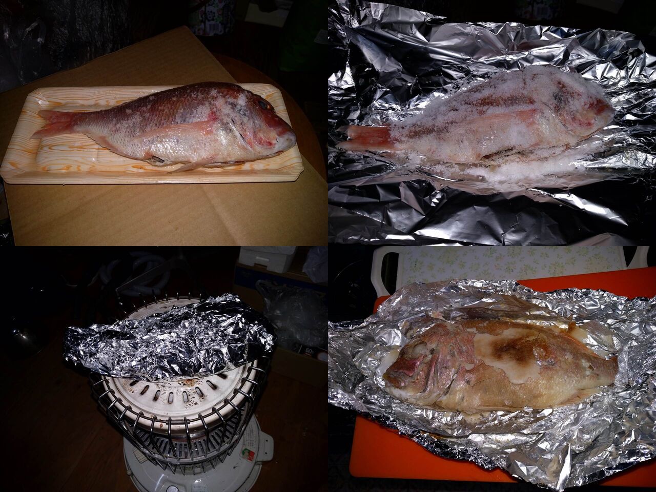 以前見た料理番組が浮かんできました。それは、鯛のような魚を沢山の塩で包みホイル焼きしていました。ということでその真似事をやってみました。内臓を軽く取った内部に軽く塩をまぶす。アルミホイルに移し裏表は少々多目の塩をコーティング。早速、ストーブで調理?開始。