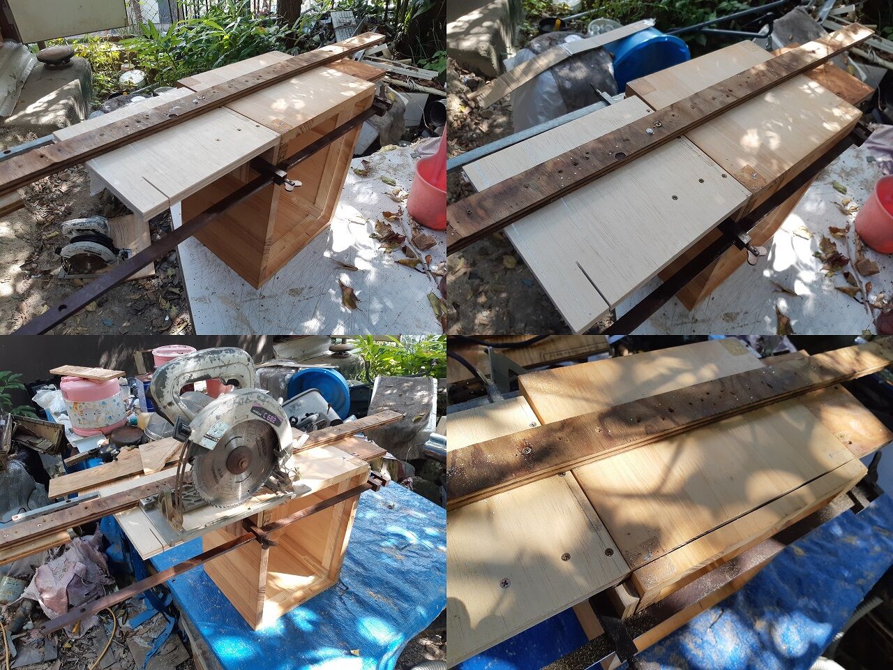 表バッフルは色々考えた末、防振処理を行うと言う前提で構造用合板(t=12)にします。その為には、四方枠をフラットにする必要があります。直線で比較的精度よく切断できる道具といえば、電鋸しかありません。(スライド鋸は板・角材なら問題ないのですが立体物は一寸、危険です)そこで、電鋸を安全にスライドできる簡単なテーブルを作りました。