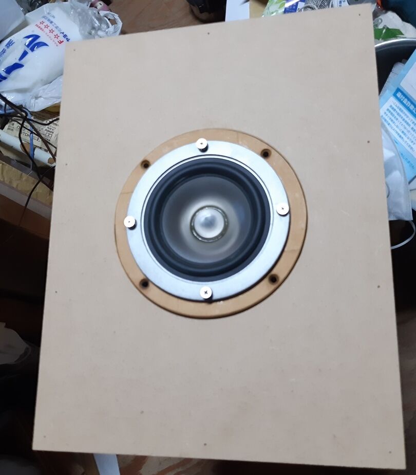 さて、本題に戻ります。表バッフルですが構造用合板(t=12)にMFD(t=4)を接着しました。何れ楕円中空体の有無の効果を確認するため表バッフルは2セット(4枚)用意することにし今日は取りあえず3枚作り、ユニットはサブ・バッフル式で取り付けます。