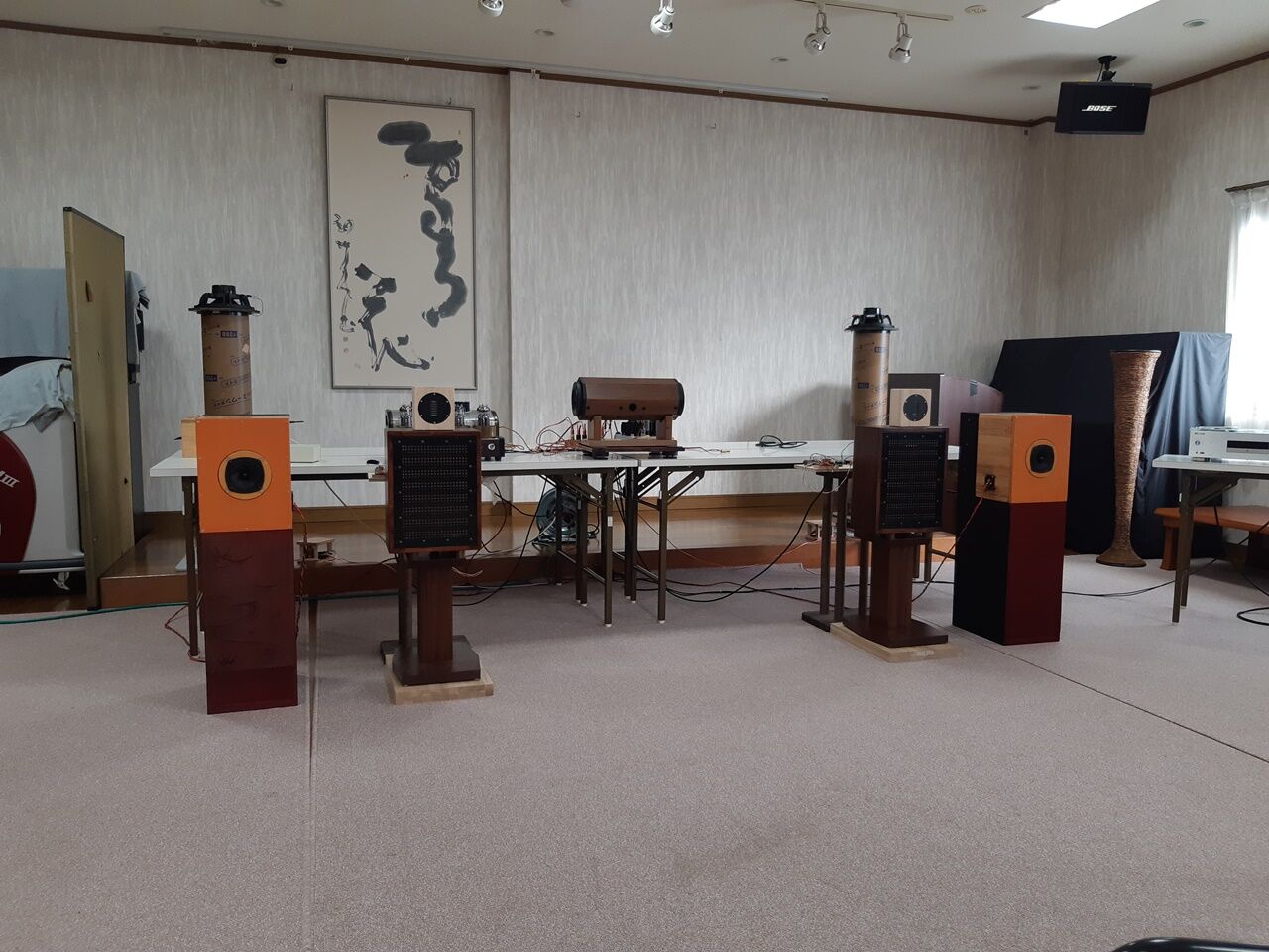 波動スピーカーはHiFiではありませんが面白い作品でした。殆どの方は、持参した真空管アンプの試聴に①を選択し私のシステムには見向きもしませんでしたが、敢えて言えば、振動板の裏面から発生する逆位相の音の処理で明確な違いがありました。昨晩、夜の部が終了する間際に同一音源での比較試聴した所、定位の素晴らしさ/クリアさは歴然としていました。