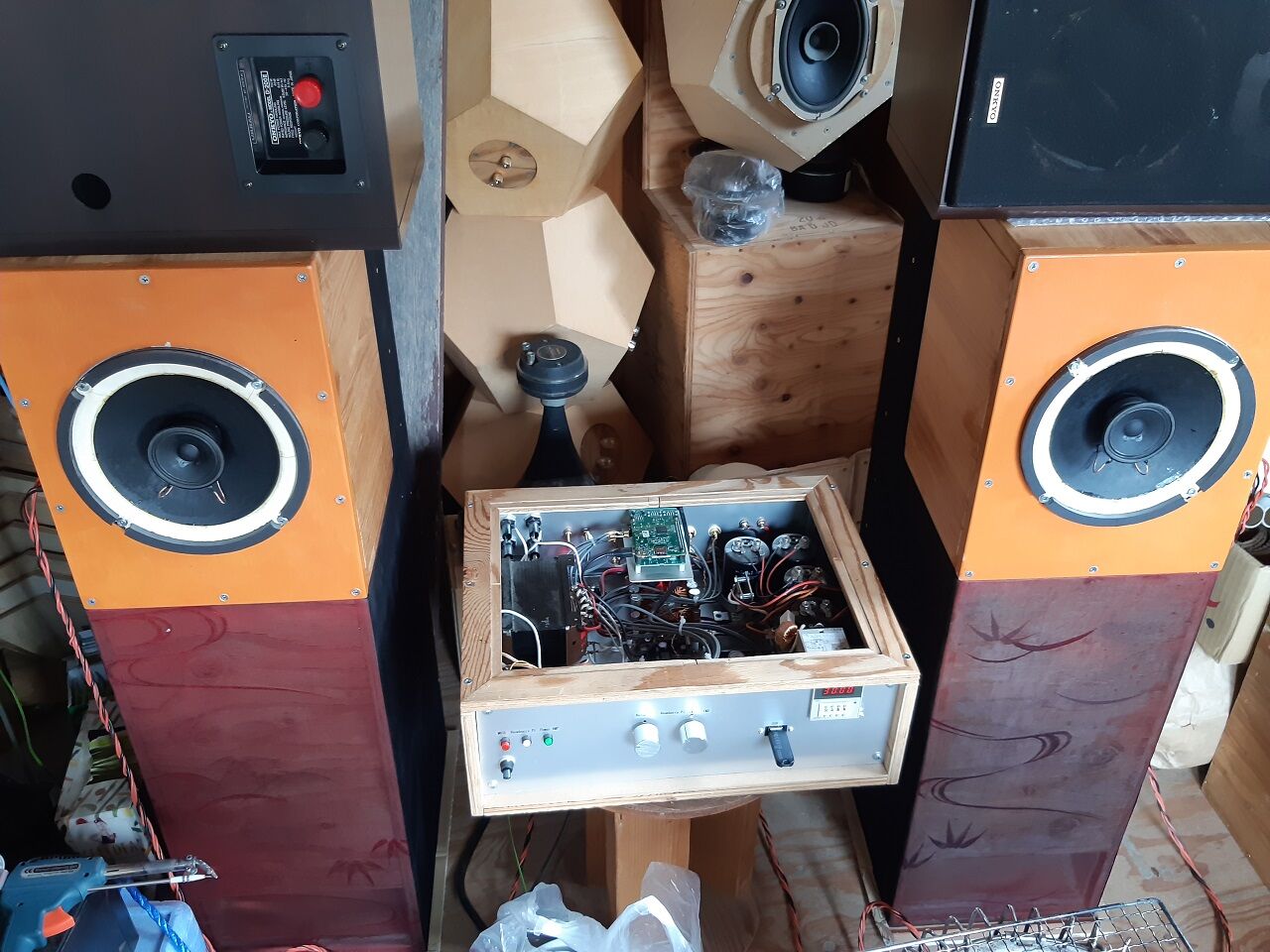 取り敢えず拙宅のシステムで、持参された音源をオールインワンアンプのラズパイに差し暫く鑑賞!。矢張りホーンブースターからの中域の漏れを指摘して頂きました。前回のSMC研究会で内部の音響調整材を外していた事が影響していた様です。Kさんより中域の漏れの調整方法を教えて頂きました。