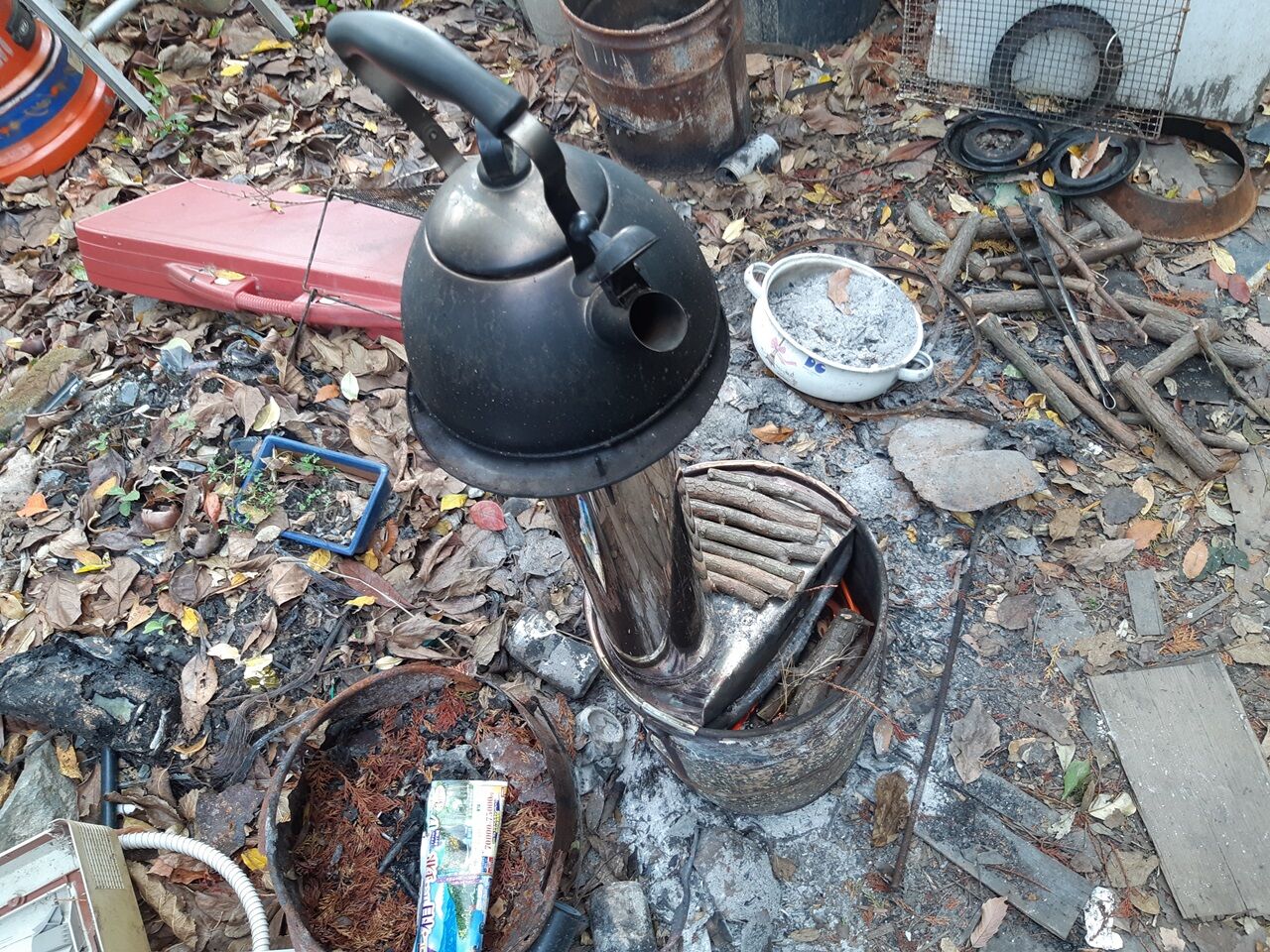 今回は、②の方法でチャレンジしました。茹でる釜は一ヶ月前に作ったロケット・ストーブを使います。煙突のところに鍋を置きます。