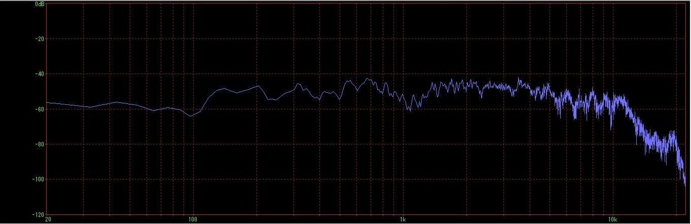 周波数特性は下記の通りです。マイクの位置は、SPシステムの間隔は1.1mとして正三角形の頂点で測定しました。(即ちSPセンターから見た角度は30°と言う事です)