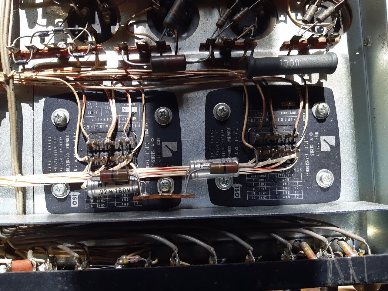 OUTはどうやら写真左側の一次巻線は運良く導通が有りますが右は駄目です。取り敢えずこの個体のレストアを優先させようと思います。幸い整備済のOUTがあるのでOUTを換装し手持ち水平出力管を使った特殊3結PPで音出し迄先行させようと思います。今回はパラPPは諦め小出力で完成させようと思います。