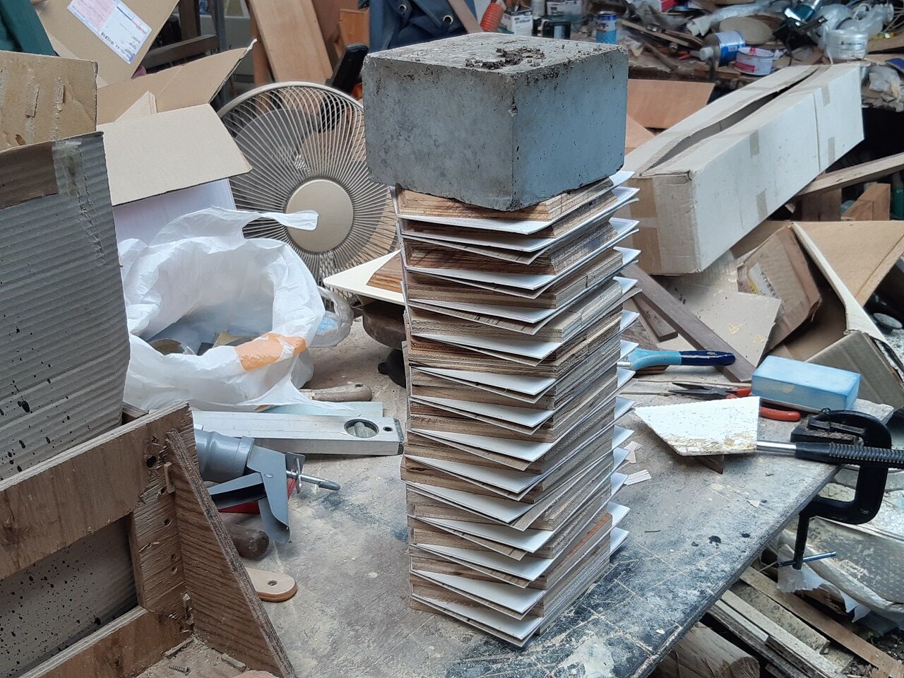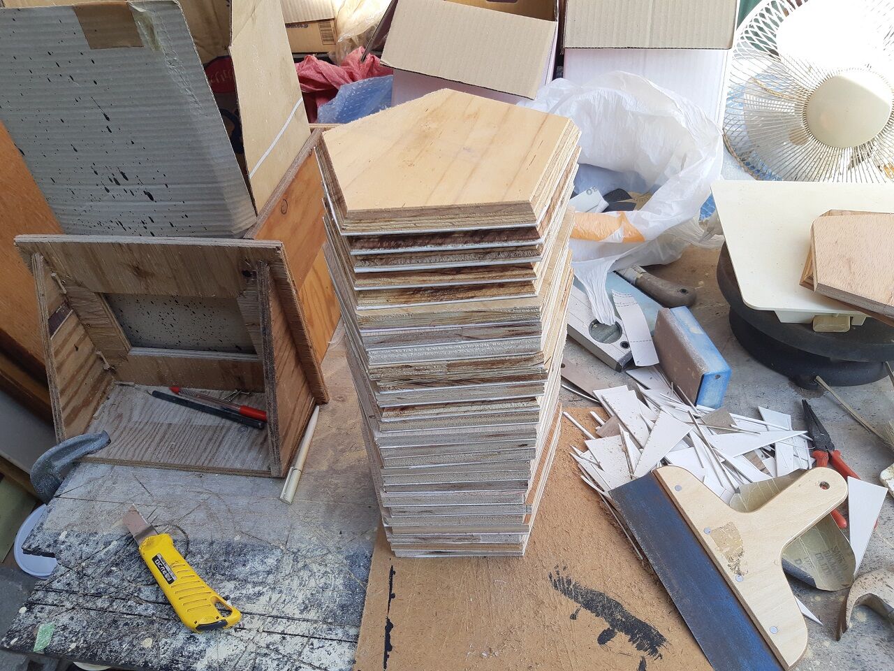 それでは、製作に掛かっていきます。先ずは、正12面体BOXの元になる正5角形を作っていきます。先ず、正5角形をラフに切り出します。そして、表面にはCF(クッションフロア)を貼るわけですがヤマハの時に使った物と同じ柄を注文しました。