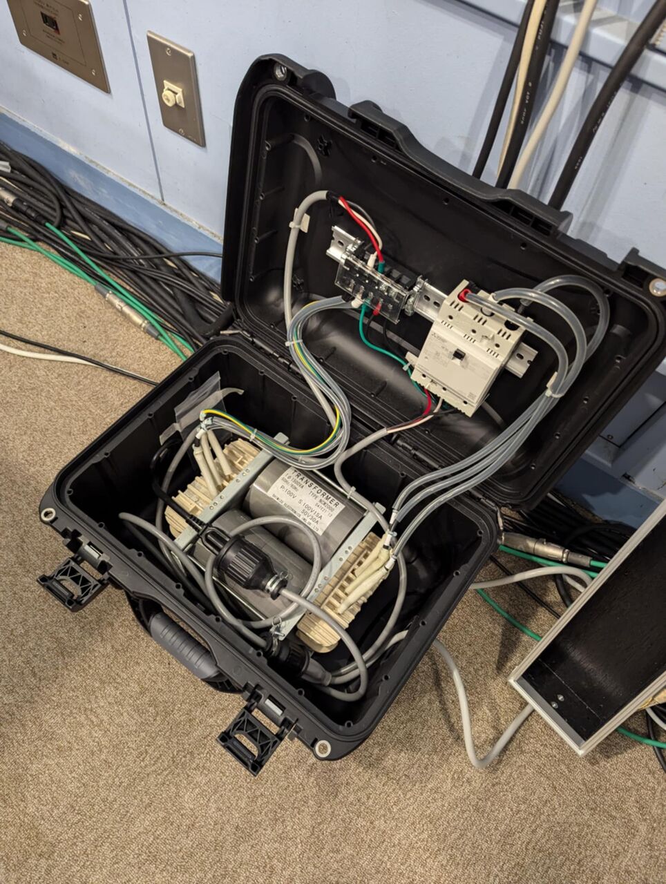 ここで、この部屋(所謂、ミキサー室)の電源についての説明がありました。アイソレート・トランスを使いその後にトランス(二次側は、50Vのセンタータップ付(アース接地))を噛ましているそうです。