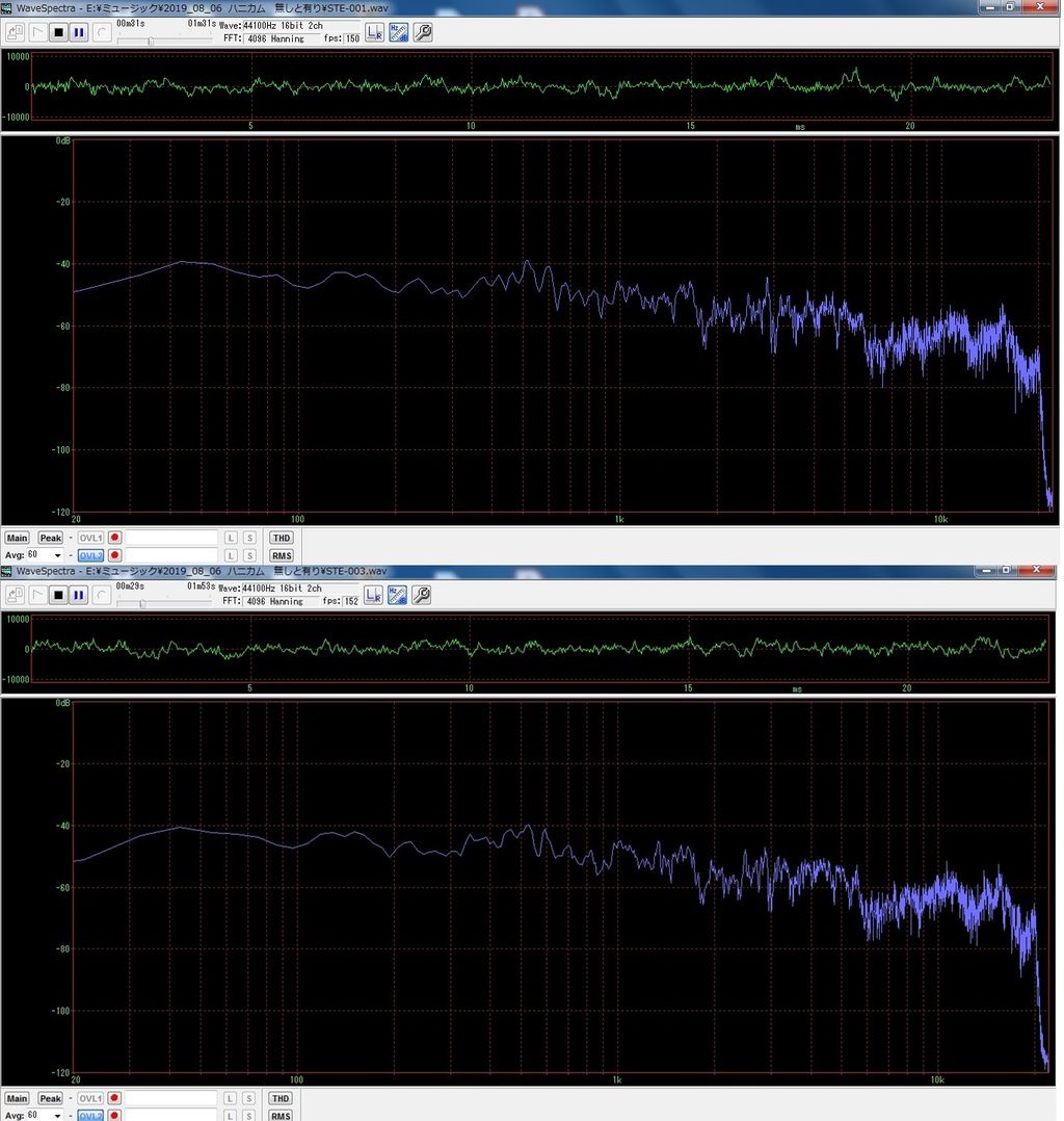 例のテーマソングを使い、同一マイク位置でハニカム無しと有りの再生音を録音し、できたWAVファイルをハニカム有りの状態で比較試聴しました。