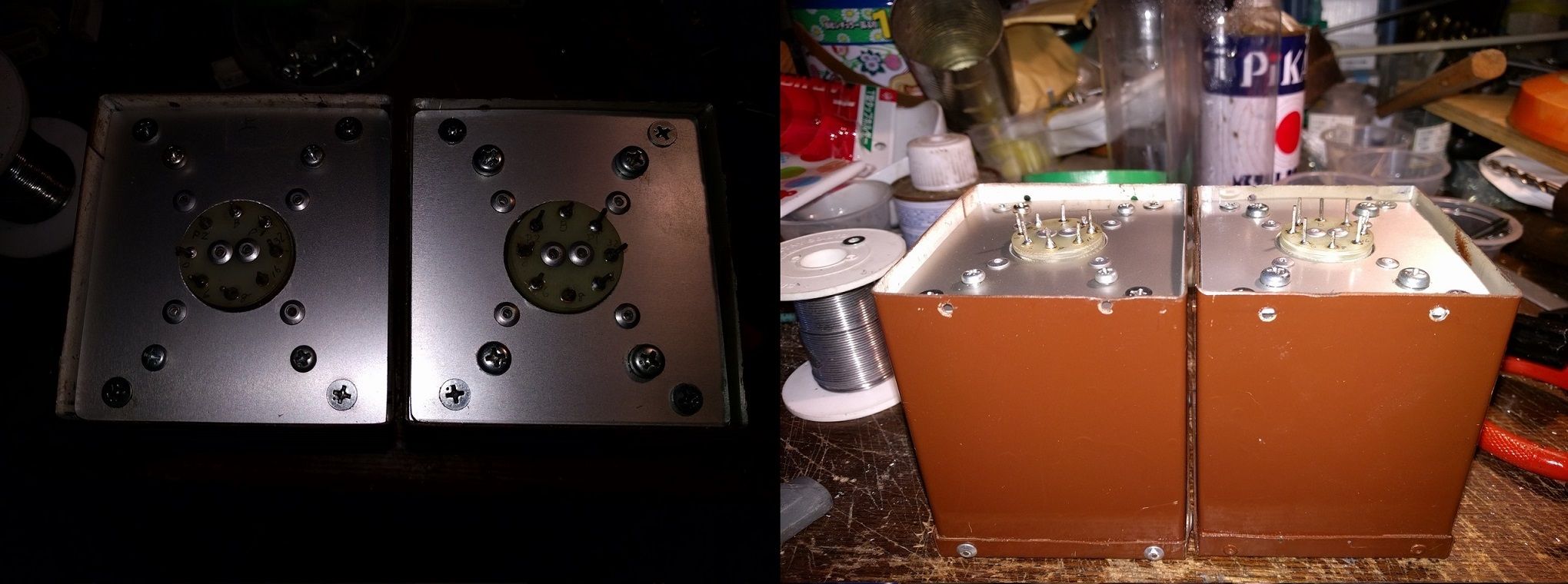 OUTはどうやら写真左側の一次巻線は運良く導通が有りますが右は駄目です。取り敢えずこの個体のレストアを優先させようと思います。幸い整備済のOUTがあるのでOUTを換装し手持ち水平出力管を使った特殊3結PPで音出し迄先行させようと思います。今回はパラPPは諦め小出力で完成させようと思います。