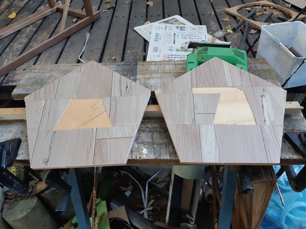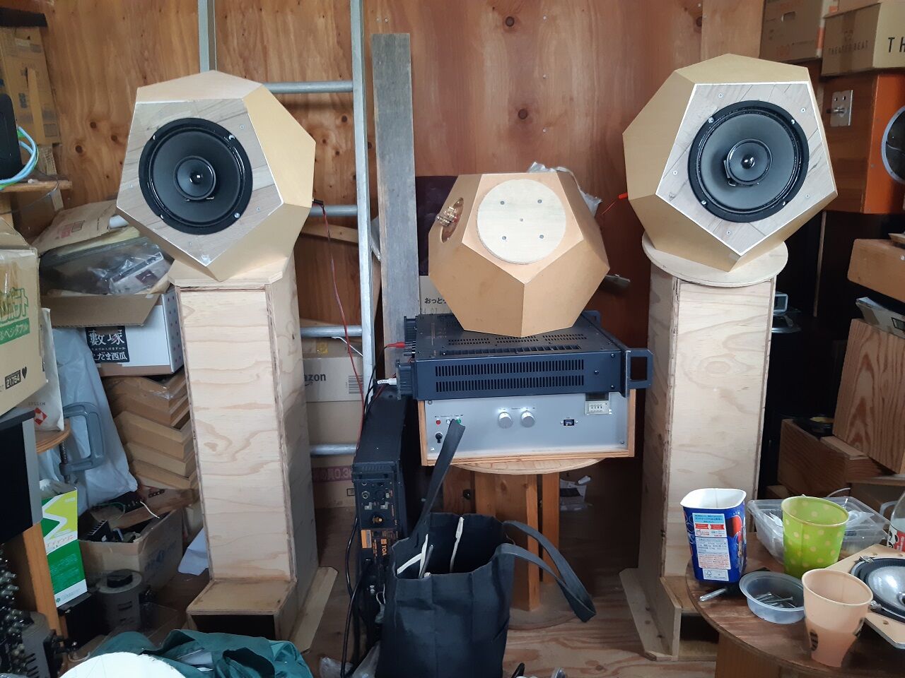 先ず、昨日の内に1台が完成しました。写真左が完成した変形12面体BOXで、右は変形加工する前の正12面体BOXです。大分、雰囲気が違います。