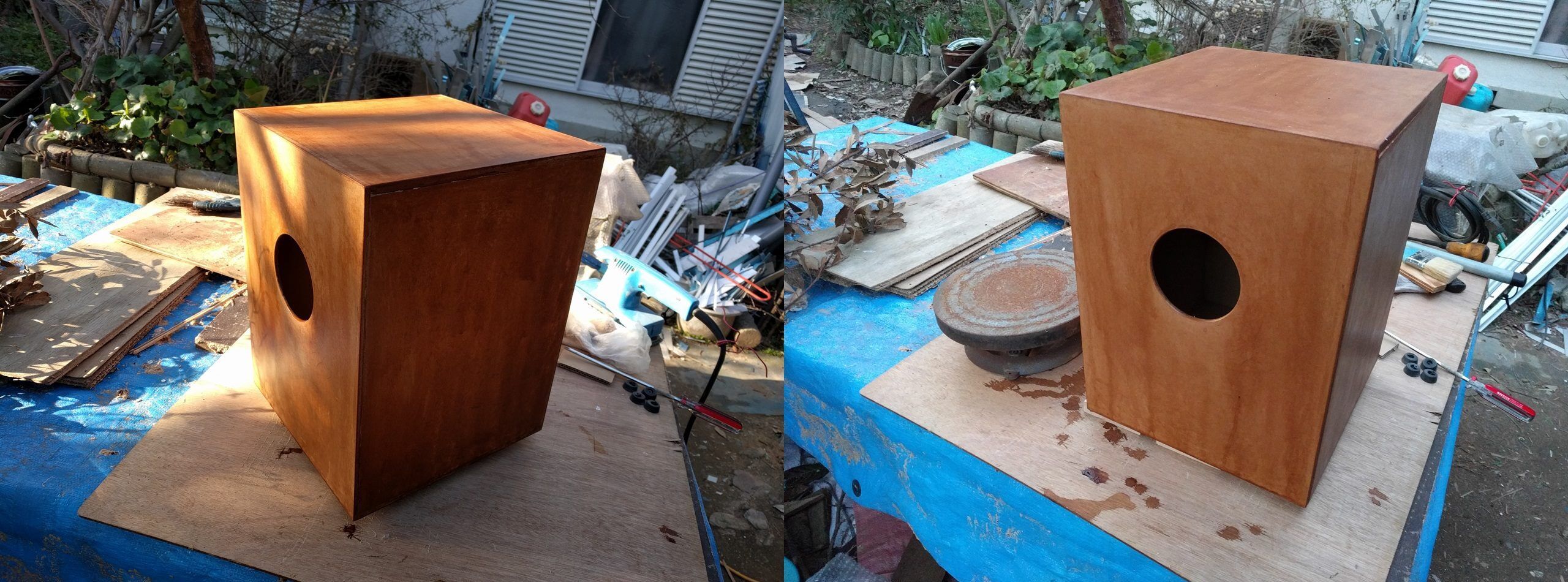 先ずホーンBOXは、図面訂正が完了したので明日から着手します。今日は数年前から娘に頼まれていた塗装を行いました。このカホーンは娘が講習会でキットを組立てたものです。カホーンの内部がどうなっているか知らなかったのでスマホでパチリ。