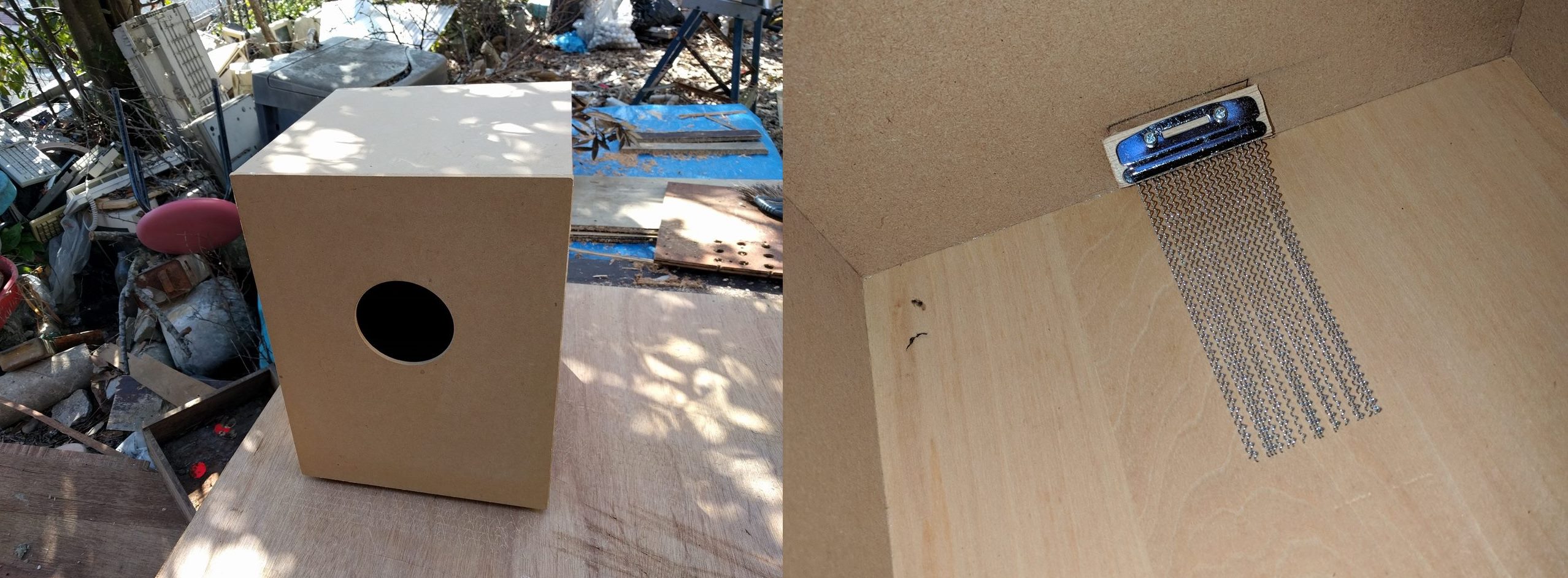 螺旋状の針金約20本が手で叩く面の内側に密着するように垂れ下がっています。そこでこの面を外側から叩くと、針金と内面の間に隙間が一瞬でき密着する際に音を発するという楽器です。写真左は、対向する面にある音道でここから音が出る訳です。このカホーンでは、針金が垂れ下がる面は、薄いシナベニヤでできており対向する面も薄いMDFでできており振動しやすい材料です。一方、他の4面は厚手のMDFです。