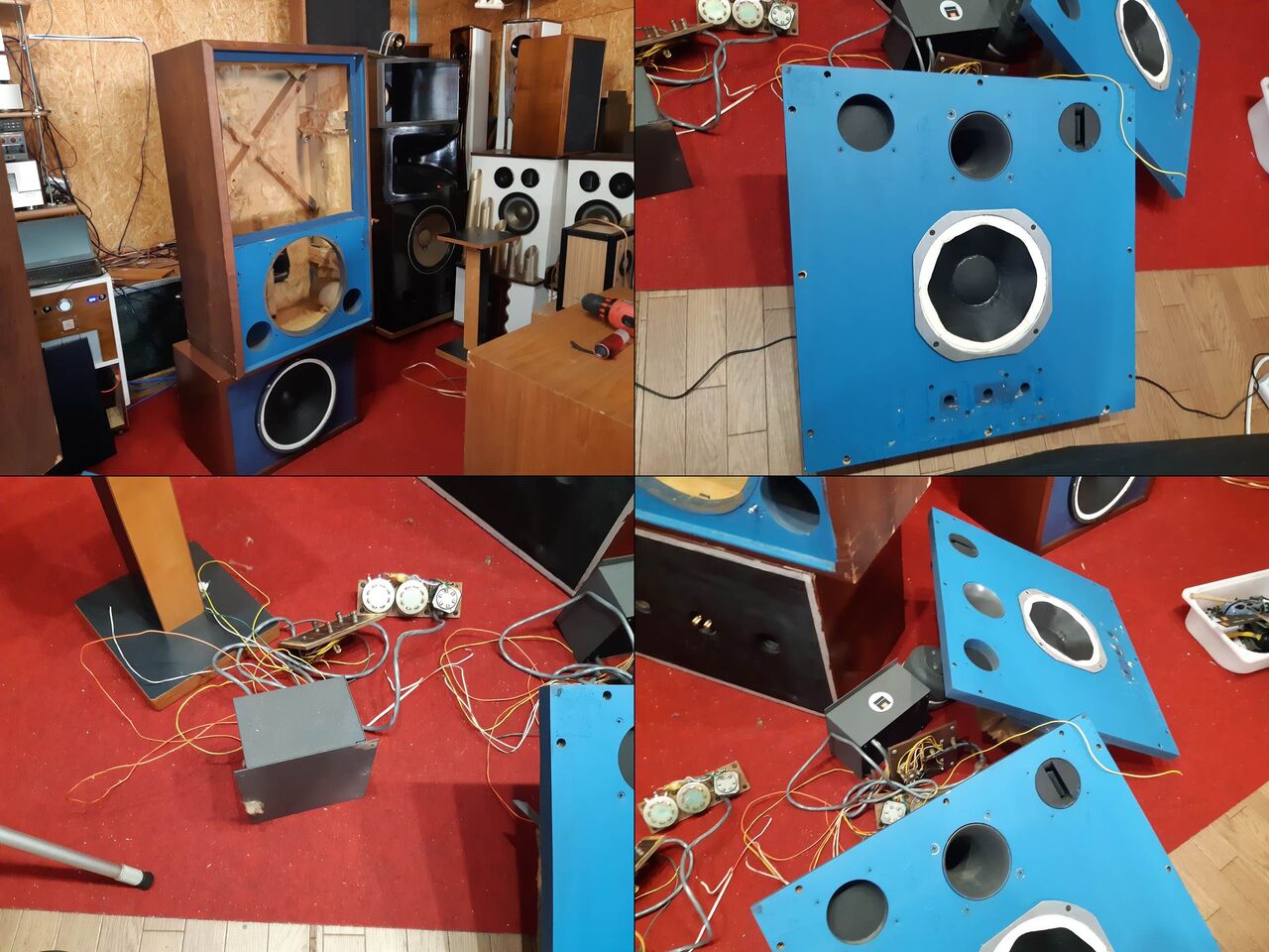 Kさんが持参したチャンデバを使ってみようという事になりました。初めは、下段のBOXをウーファーに見立て試聴。効果は、僅かなのでこの写真の左右の外側奥に見える38cmウーファーにチェンジ。