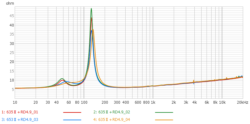 インピーダンス特性は、4台測定しましたが少々ばらつきが有るようです。