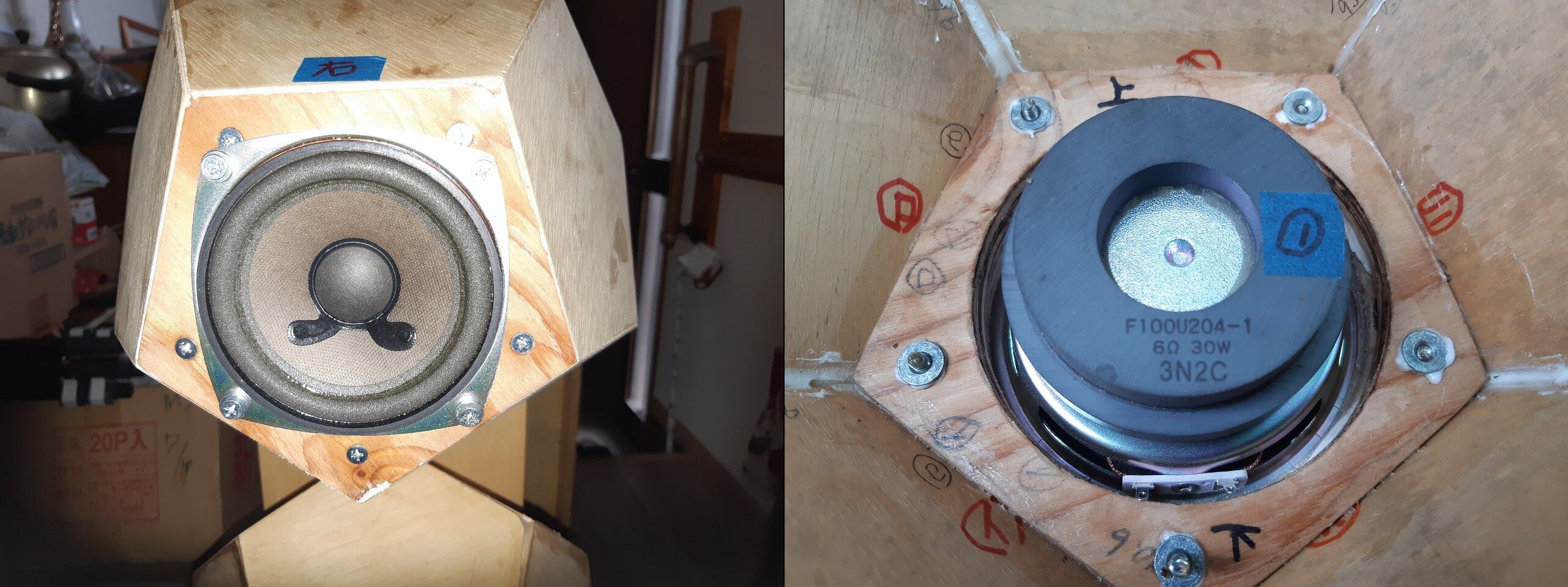正12面体BOXのサイズとしては、一辺が95mm(内容積が約4.9ℓ)のBOX(バスレフ型)を上下に二個配置するものです。