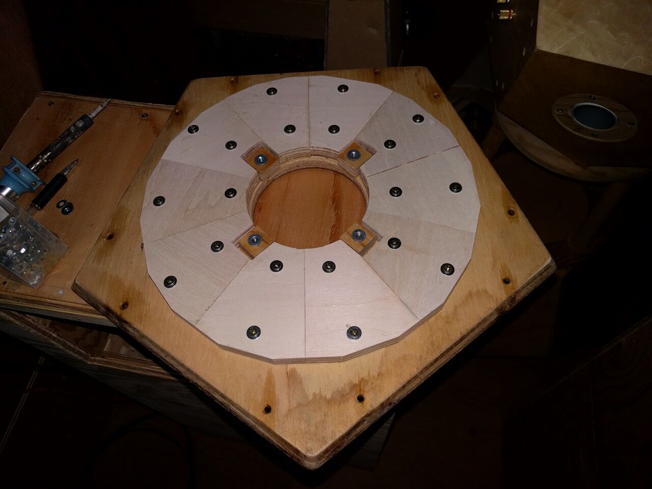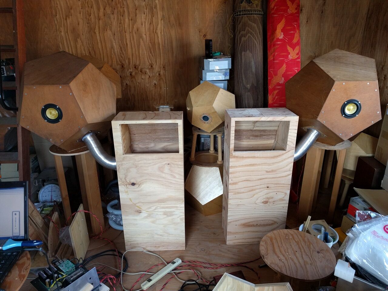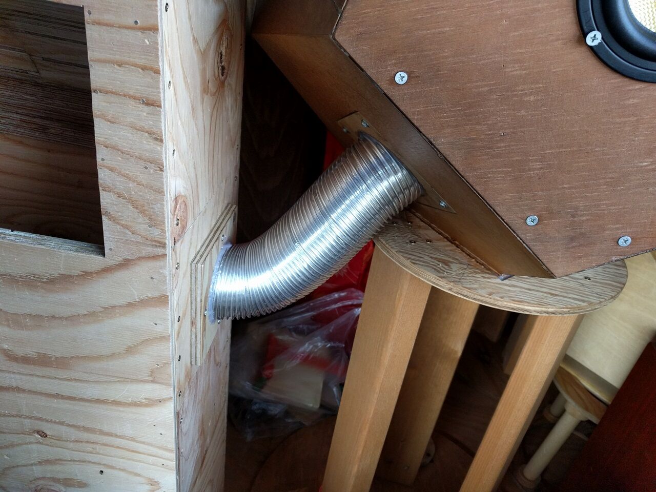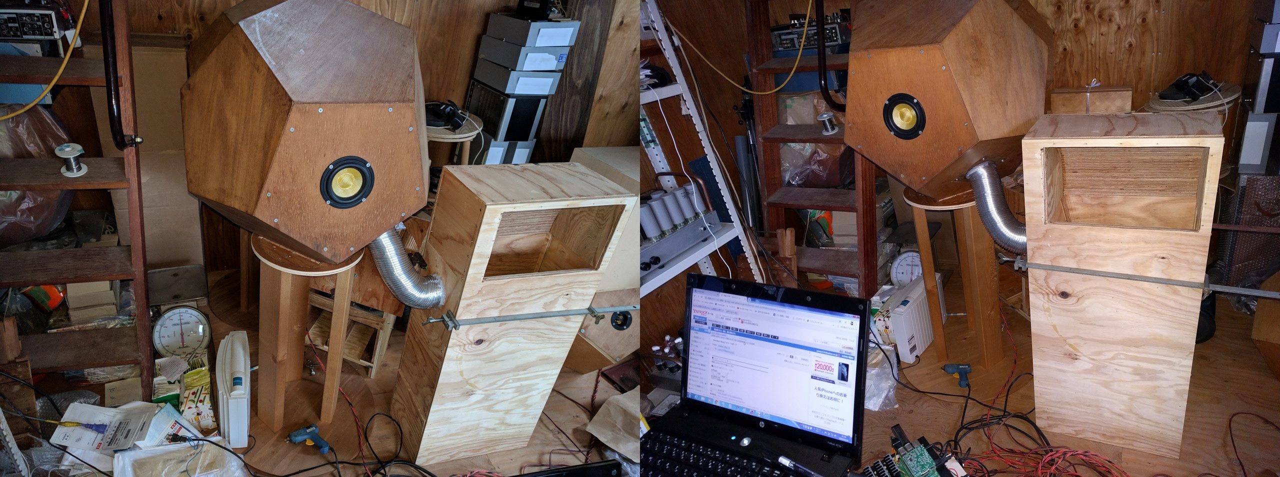 写真の装置を天地逆にして、開口部を床面に近づける案です。床面によるホーン開口の延長効果が見込める様に思います。もし効果が強すぎる時は、とりあえず雑誌などで、床面より少しづつ持ち上げてやれば、最適解が見つかる様な気がします。