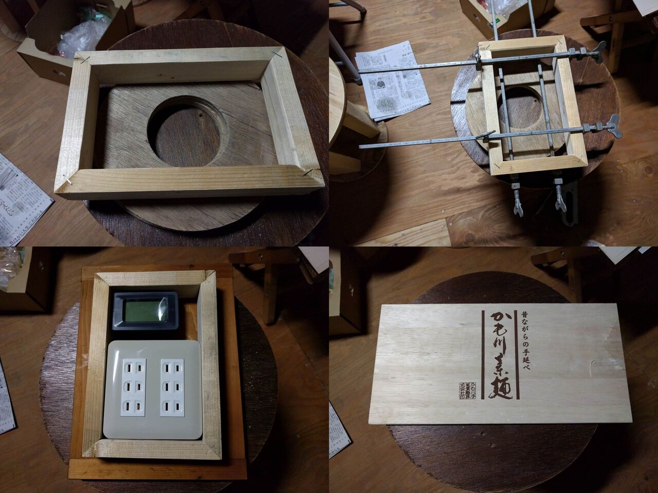 2019年11月12日 デジタル電力計の設置(2) 今日の午後から電力計を収納する箱の製作を始めました。少々アクシデントがあり枠製作が精一杯でした。スライド鋸があるのでトメ加工とします。 材料は、2×4角材。設計図通りにカットした物を速乾性木工ボンドを塗布し即、四隅の両側をタッカーで仮固定。さらにクランプで確り固定。徐にバラシ、パーツを仮置きしてみました。ほぼ設計図通りのできです。上部パネルには、素麺が入っていた木箱の蓋を流用します。もうあと一歩で完成です。 つづく