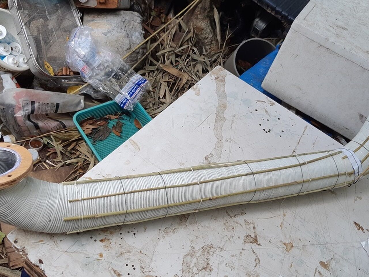 内容としては、 アルミフレキの防振対策(2)の続編に当たります。アルミフレキの表面をシリコン・シーラントでコーティングしたのですが未だ不十分です。今までの試行錯誤から表面をギプスで覆い一体化すれば格段に良くなることが分かっています。一般的には、ギプスはガーゼに石膏を含浸させ一体化させていますが今回はシート状の不織布が一巻あるのでこれを使ってみました。余談ですが、ガーゼはコロナ対策用のマスクの需要があり品薄状態で一家族につき一袋(30cm×10m)しか買えないのです。