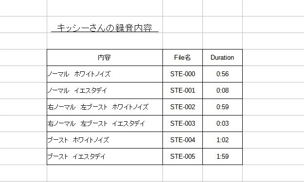今回は、商品と共に録音機を送り再生音の収録をキッシーさんにお願いしました。合計で6つのファイルが出来ていましたが、結果的にはホワイトノイズの比較ができました。キッシーさんのご協力の賜物です。