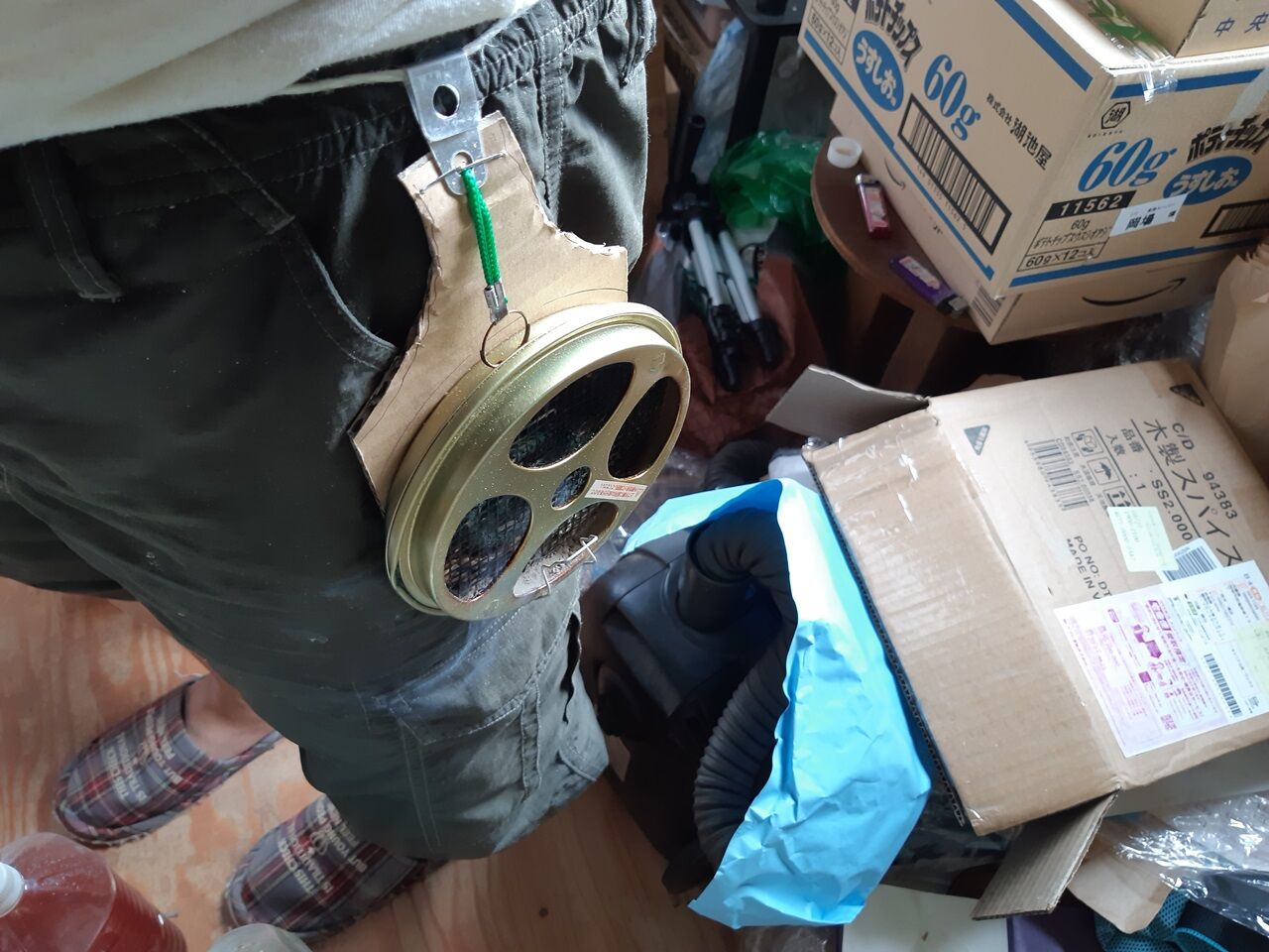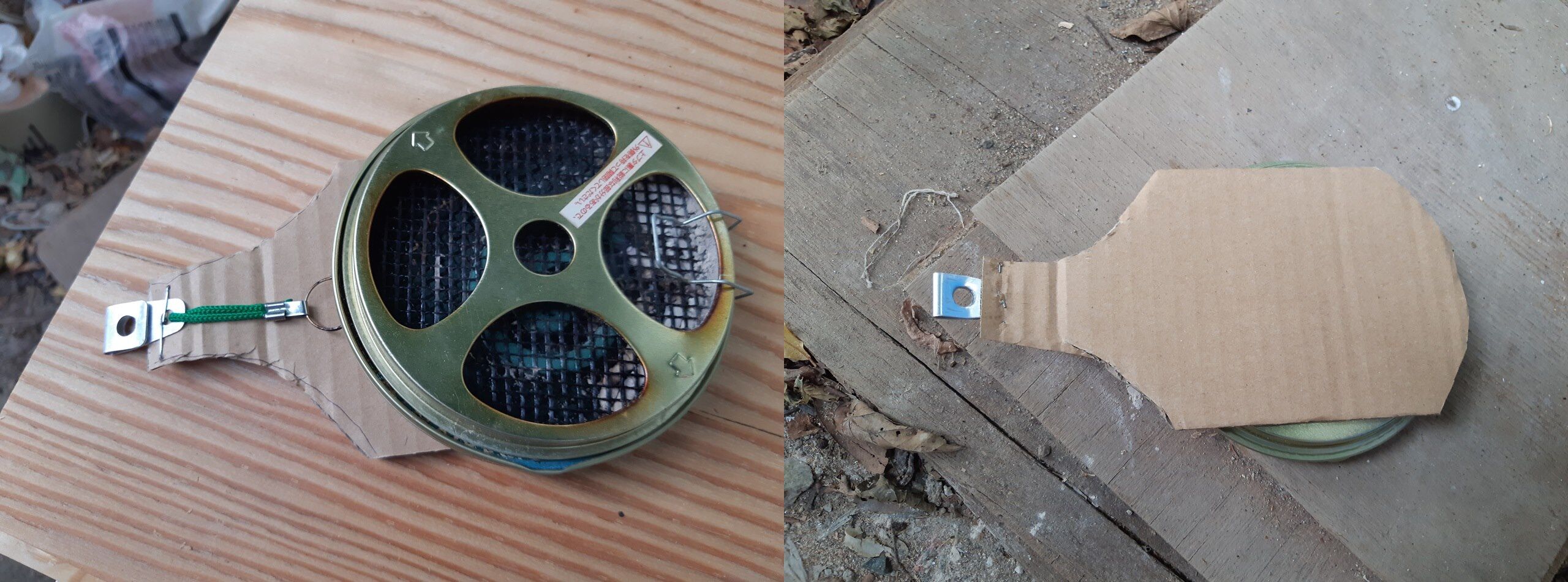 2020年09月02日 携行用香取線香入れを使い易くする! 今の時期、野外活動に必須なアイテムは香取線香です。で、つい最近買ったのが携行用の入れ物です。ところが使ってみると線香を入れている容器が頻繁にひっくり返るのです。 今日は、業を煮やし一寸だけ使い易くしてみました。 内容は至って簡単です。適当にダンボールをカットしバックル固定用の金具と本体容器を一体化すればOKです。金具はタッカーで本体は両面テープで固着します。 使用中はこんなスタイルです。結構活けます!。
