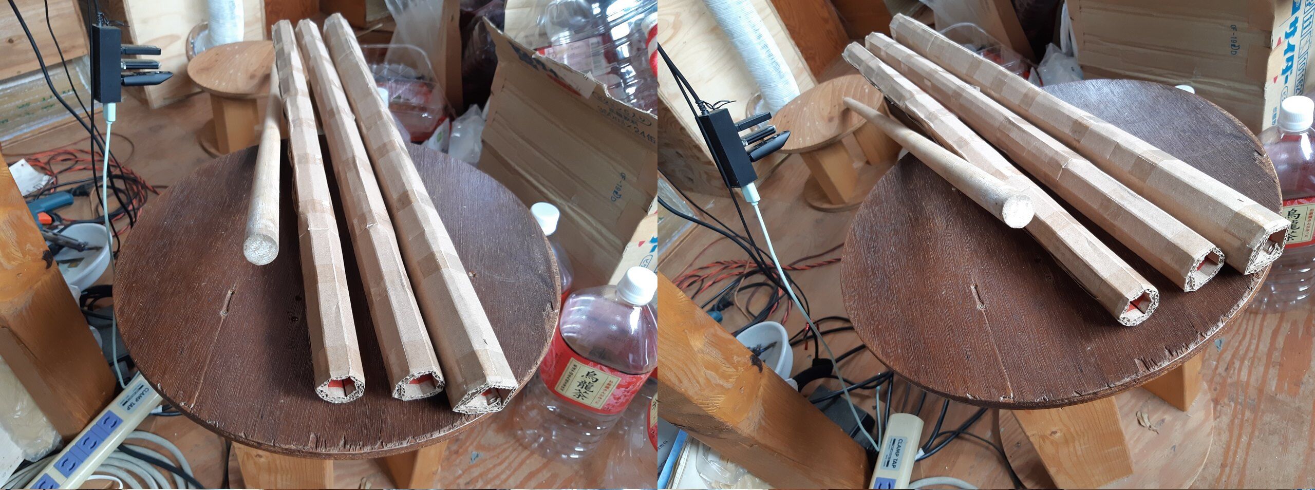 2020年09月06日 ダンボール製の吸音管を作る 以前、SP・BOX内部の特定周波数を吸音する為に試作したものです。周波数は概ね130Hz辺りです。 先ずは、閉管/開管での共振周波数を求める式を知る必要が有ります。丁度、気柱の振動が参考になります。 用意するものは、以下の通りです。・使用済みダンボール・適当な円形の棒又はパイプ・接着のり、セロテープ、スケール 作り方は、至って簡単です。①ダンボールをカットする。接着用の糊しろも加算しておく。②円形の型(棒/パイプ)にダンボールを巻きつける。③糊しろに接着のりを付けセロテープで糊が乾くまで放置。 ローコストの吸音管は如何でしょうか?