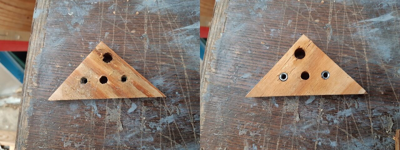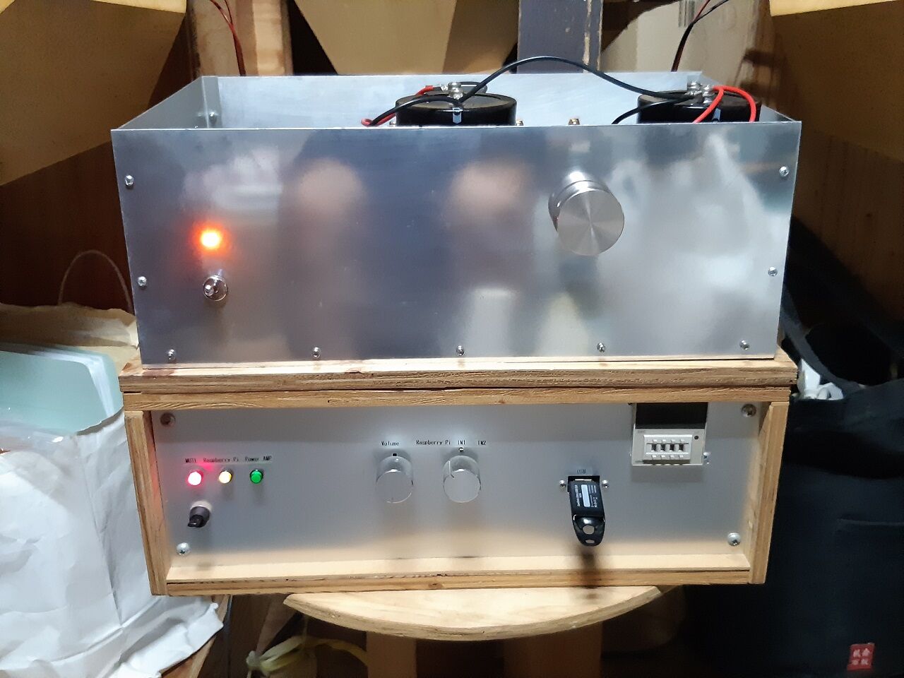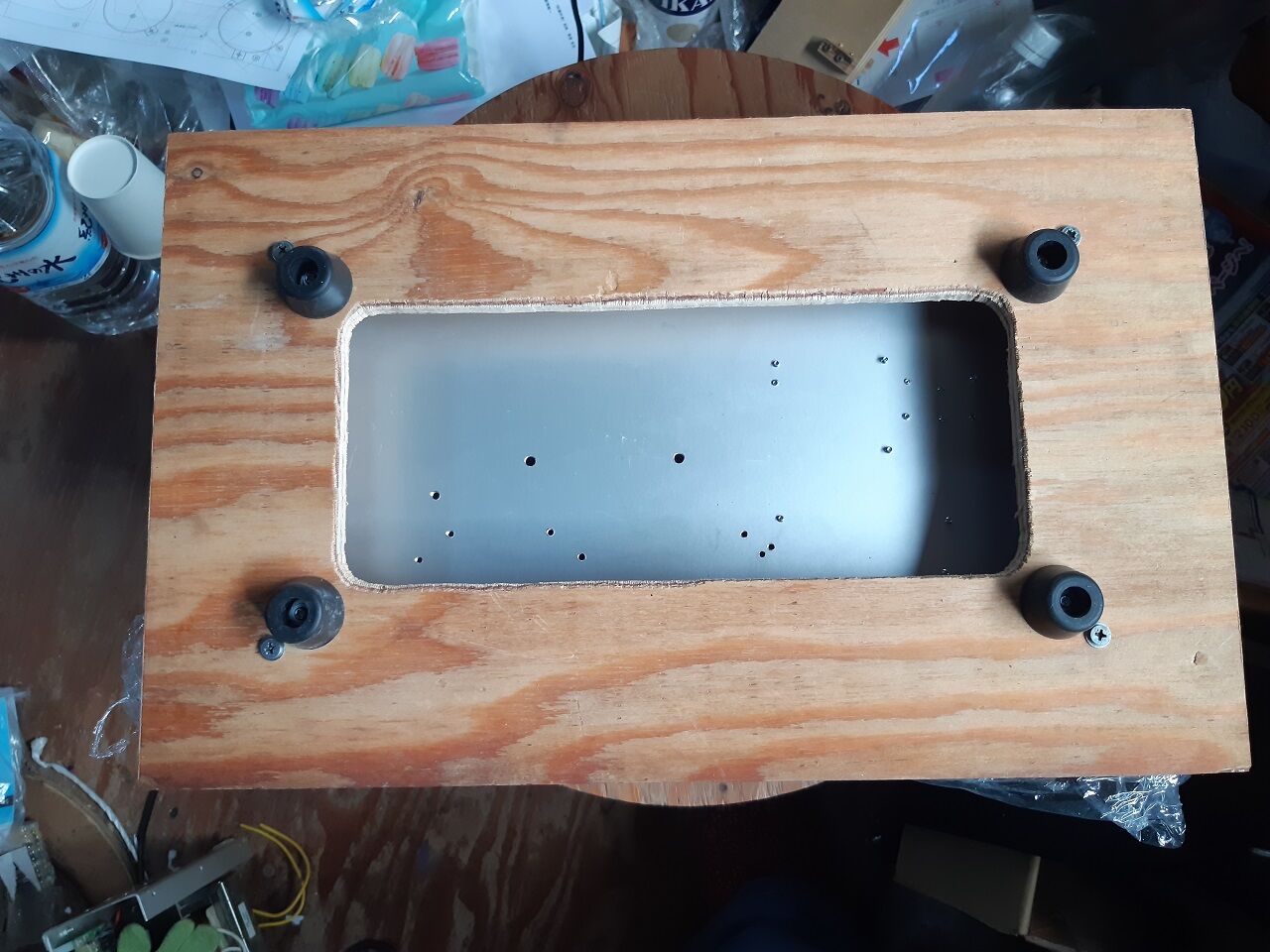 2023年09月12日 YDA138を使ったD級アンプの製作(5) 配線をする前にやっておく事が有りました。最終的には、本体ケースを木製BOXに収納する訳なのですが、取り敢えず木製BOXの底になる部分をシャーシに先行して取り付けて置きます。こうしておけば、本体ケースのままでも持ち運びが楽にできるからです。 色々と考えた末に、アダプターを作ることにしました。機能としては、「シャーシとアダプターが確りと固定」でき更に「アダプターと底板が確り固定」できることです。そこで、コンパネにそれぞれの機能を持たせ張り合わせる事にしました。 先ず、シャーシ側は埋め込み式の鬼目ナットを二個取り付けます。次に、底板側には爪付鬼目ナットを取り付けます。そして、両方を確り固着すればOKです。 アダプター取付状況並びに底板取付状況は下記の通りです。 これで、やっと配線に掛かれます。