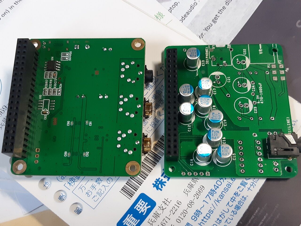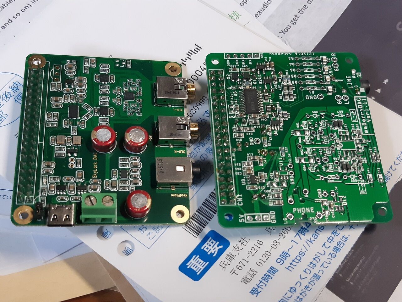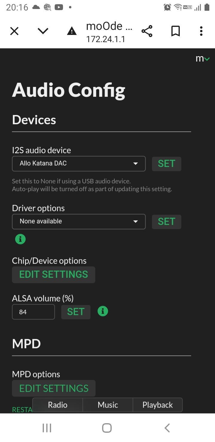 2024年10月02日 ラズパイDACの交換(2024/10/02) 今まで問題なく使っていたMs berry DACでしたがついに永眠してしまいました。満4年間は、使えたことになります。 で後継機種は、Kさんの助言でマスターモードをサポートできる物から選択しました。日本製では、AVIOT DAC01が僅かに売っていたようでしたが、流石に¥18,568-(税込み)は払えないのでAllo Katana DACを購入しました。 先ず、基板の実装状況を比較してみます。左_Allo Katana DACで、右_Ms berry DACです。部品点数は、Ms berry DACの方が多いようです。DACを交換したときの設定の変更は、下記の通りです。I2S audio device をAllo Katana DACに変更したらすんなりと音がでました。エージング無しの状態での比較ですが、私の駄耳では、Ms berry DACと同程度かそれ以上の様に聞こえます。10/19に三田オーディオ研究会があるのでそこでKさんのMs berry DACと比較する予定です。