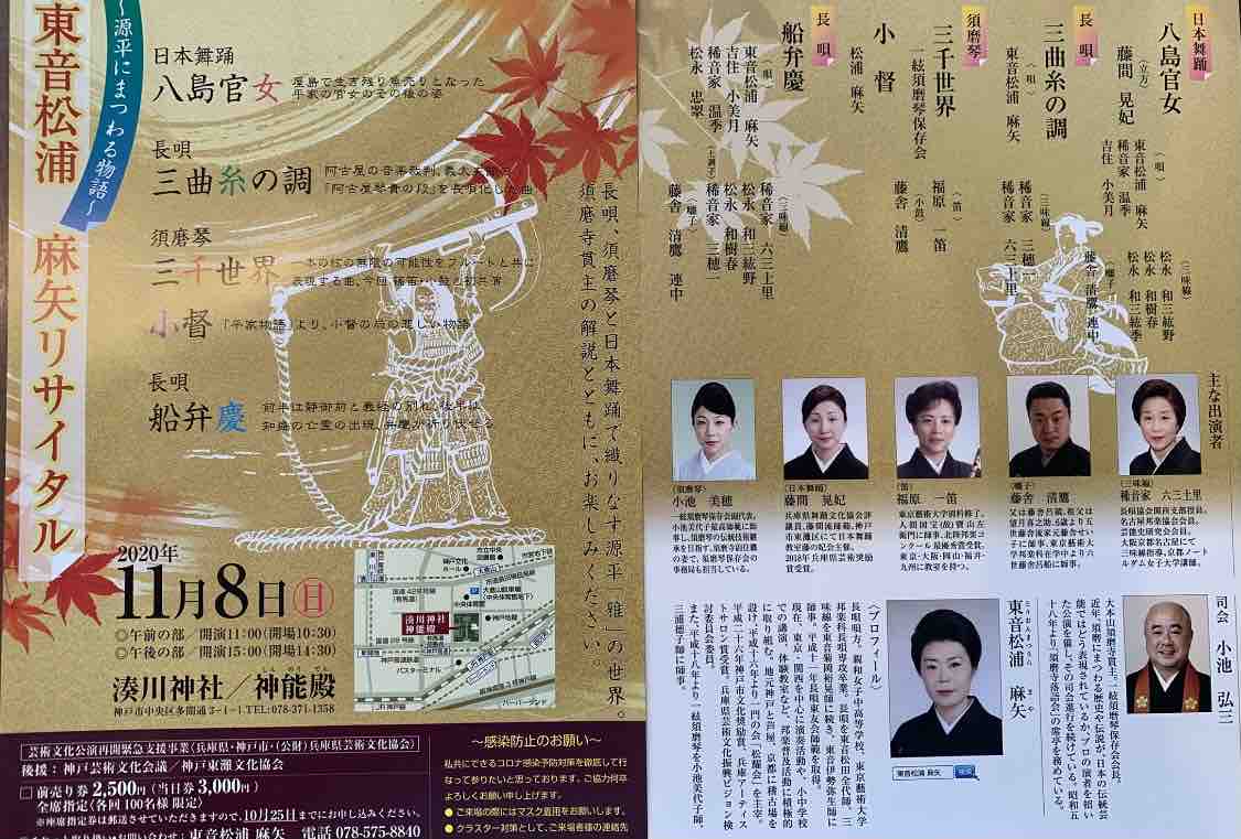 今日は、娘の知り合いが出演した「東音 松浦麻矢リサイタル」を鑑賞するために出かけました。場所は、JR神戸駅から数分の湊川神社/神能殿。