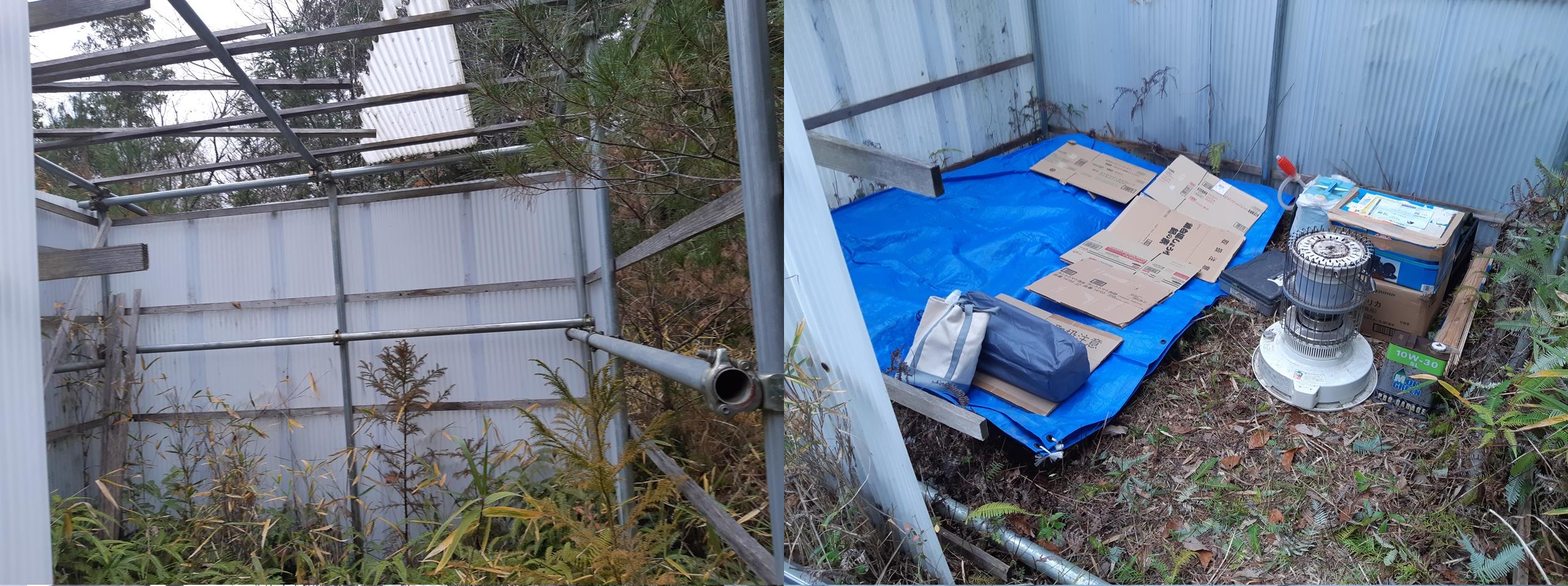 ・13:00 キャンプ地に到着。屋根に張ったブルーシートの至る所で水溜りが発生。頭を捻り