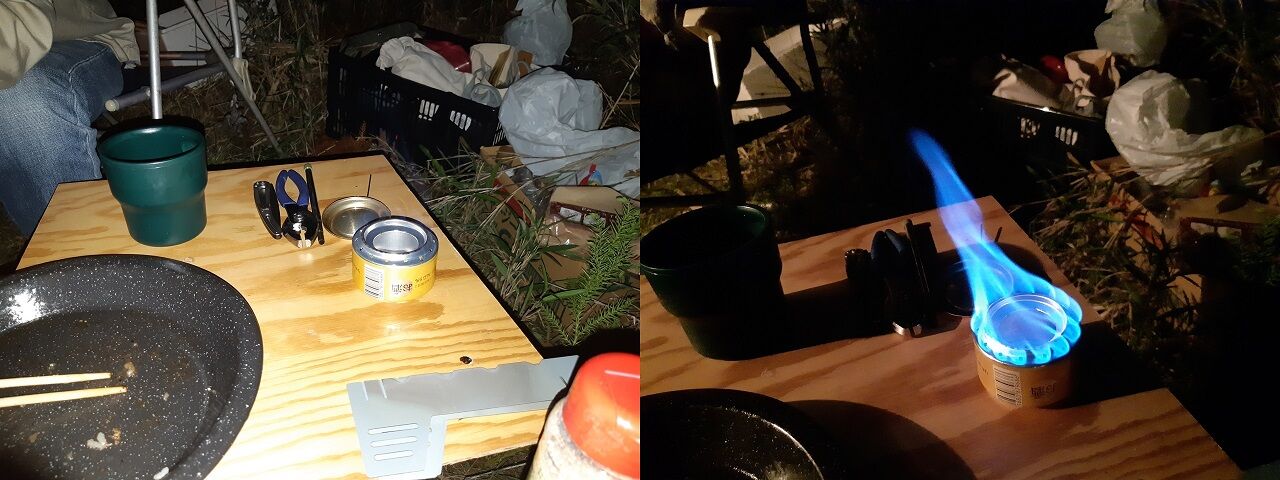 は脱帽。Nさん製のアルコールストーブの試運転→怪しげな光を放つ→肝試し