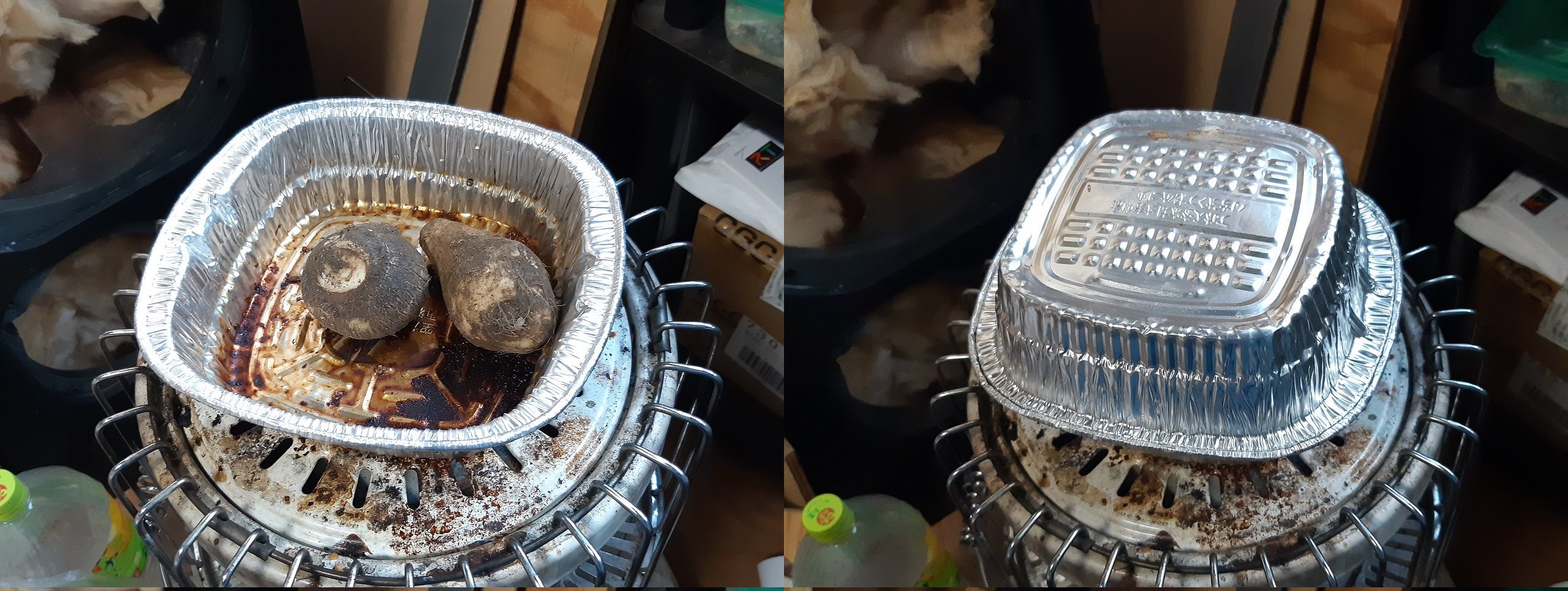 ・ロケットストーブの煙突上端に五徳を置き里芋が入った容器を載せる。