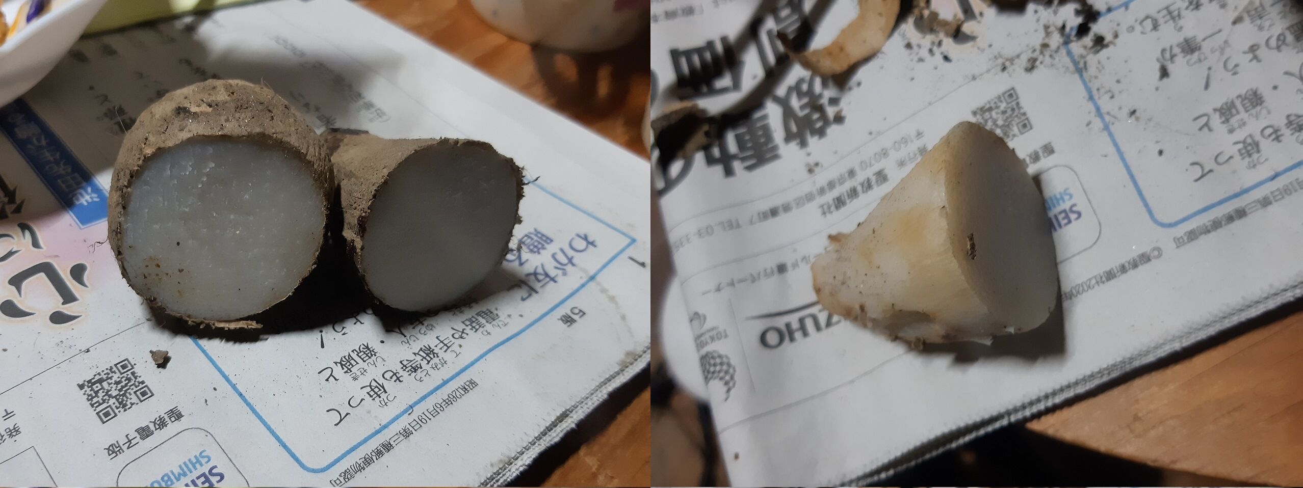 ご覧の様に、皮の部分は面白い様に剥けます。後は、黒ずんだ所を取ってやれば即料理に使えます。既に熱処理されているので、煮込む時間は可成り短縮できます。