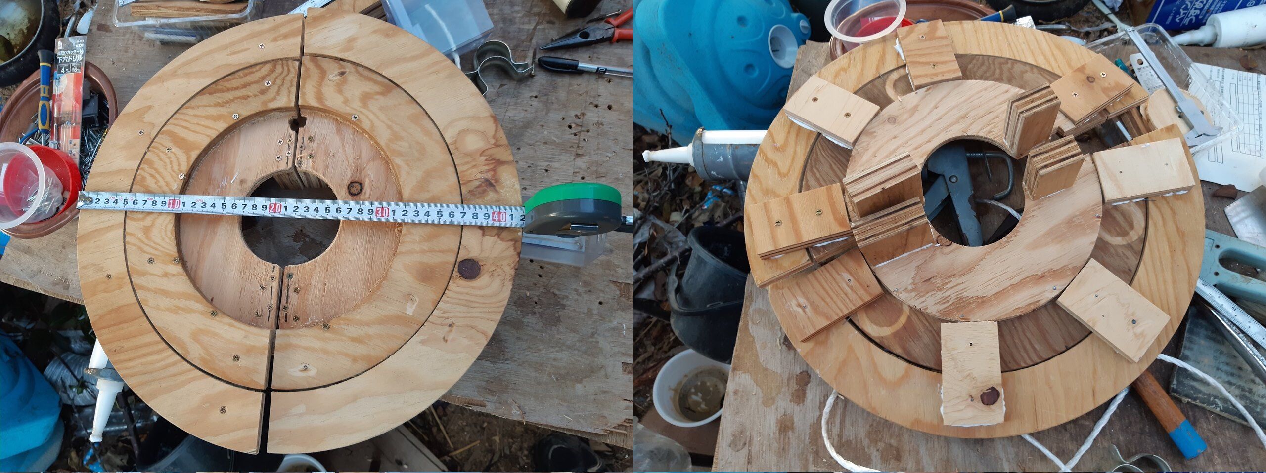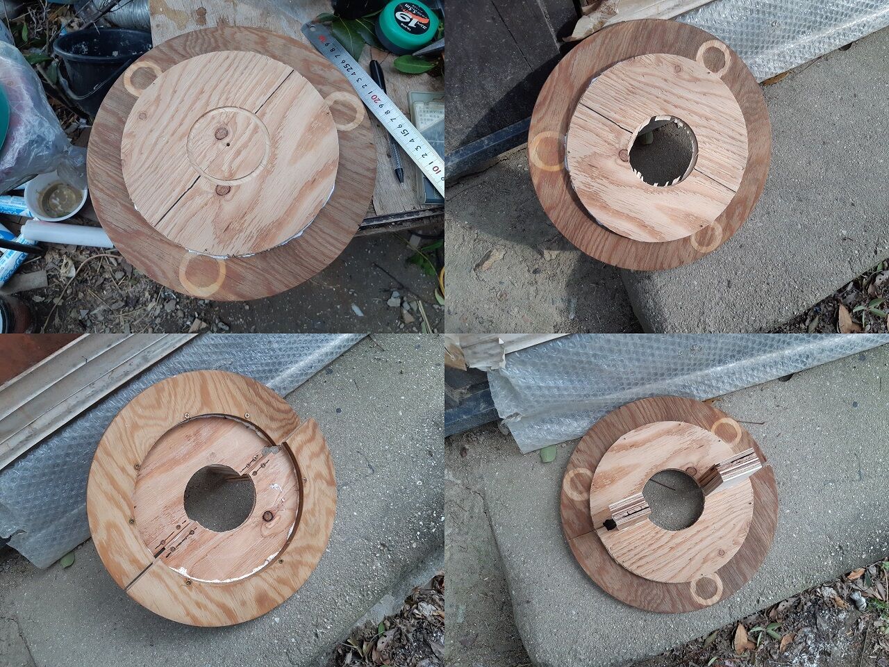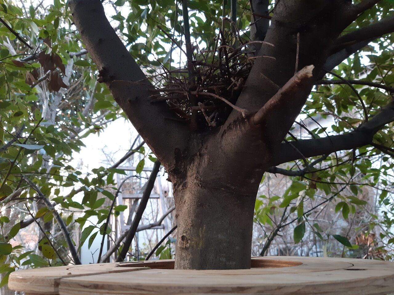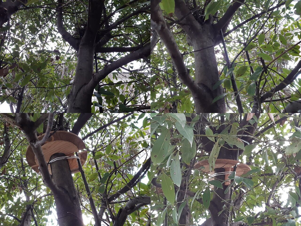 巣には手を加えずそして、木(月桂樹)にも優しいことを目指し作りました。結果的には、もう少し円板の径を大きくしてφ400程度にしないといけないようです。