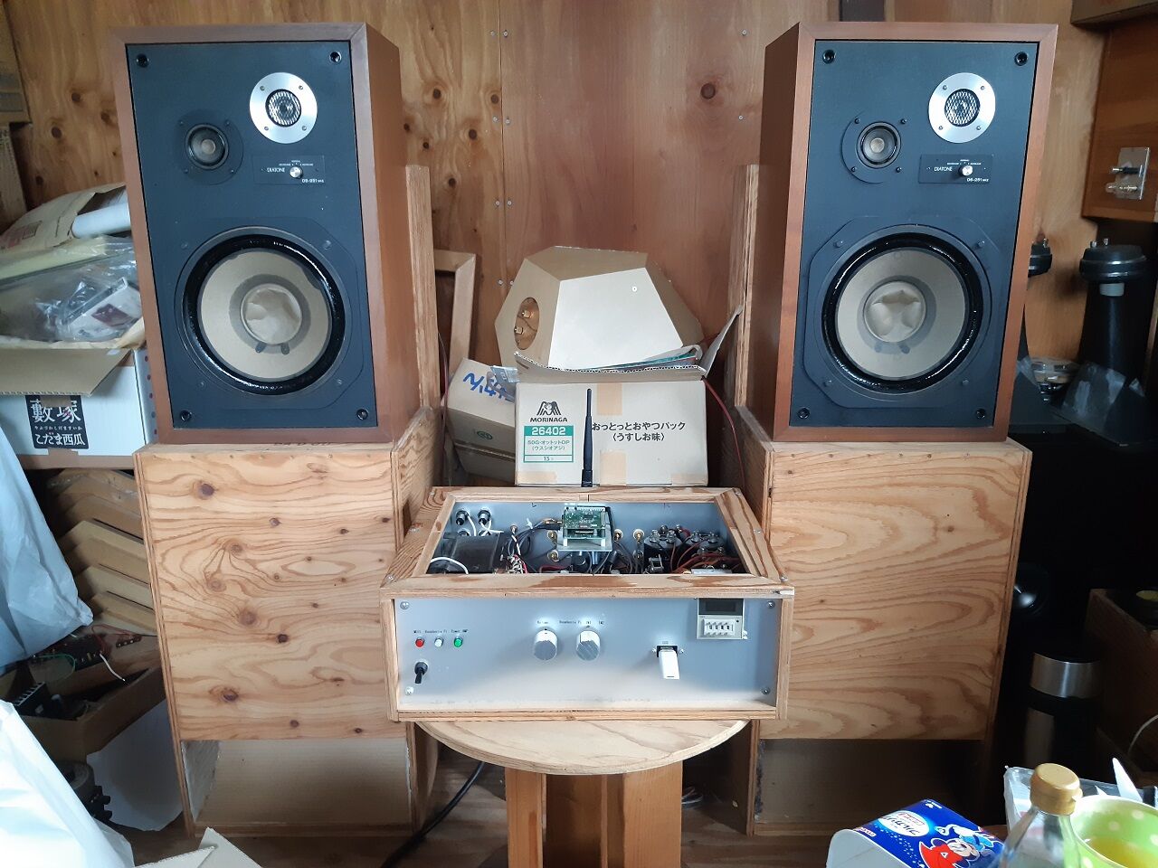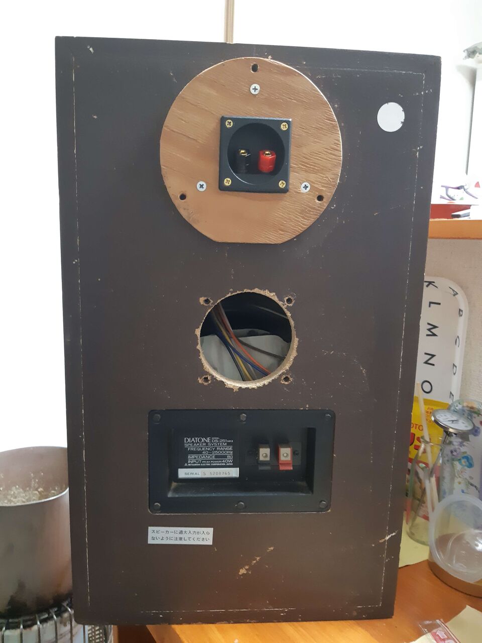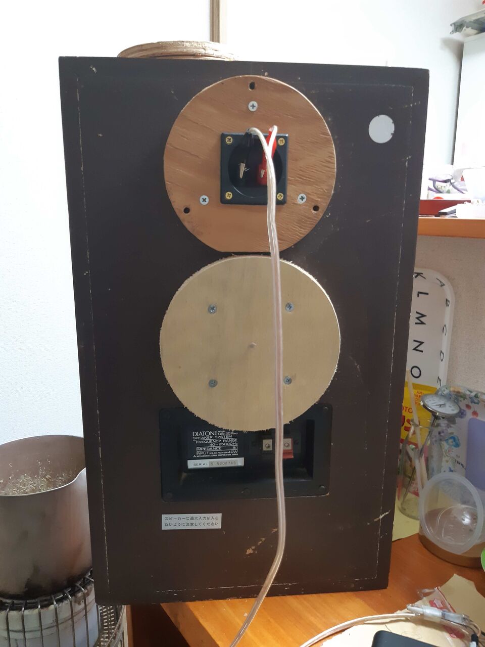 訳有って、YAMAHA NS-3M Xを手に入れました。仕様は、リンクから参照下さい。今回の取り敢えずの目的は、スピーカーユニットを正12面体BOXに移植して様子を見ることです。取り外したユニットの銘板を見ると2Ωなので内部に有るNWとペアで使う仕様の様です。NWを流用する為には、箱をバラさないと取り出せないので先ず1台を解体しました。