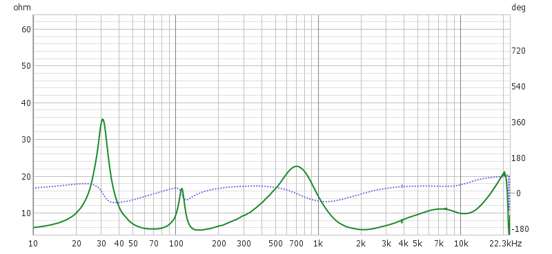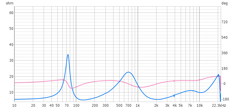 ・ユニット単体のインピーダンスが2Ωと異常に低い。意図が良く分らない。若しかしたらNWと組み合わせることで、周波数特性や耐入力などの改善を狙ったものか。因みにNWには直列抵抗として1Ωが入っており更にピークカット回路が直列に入っている。