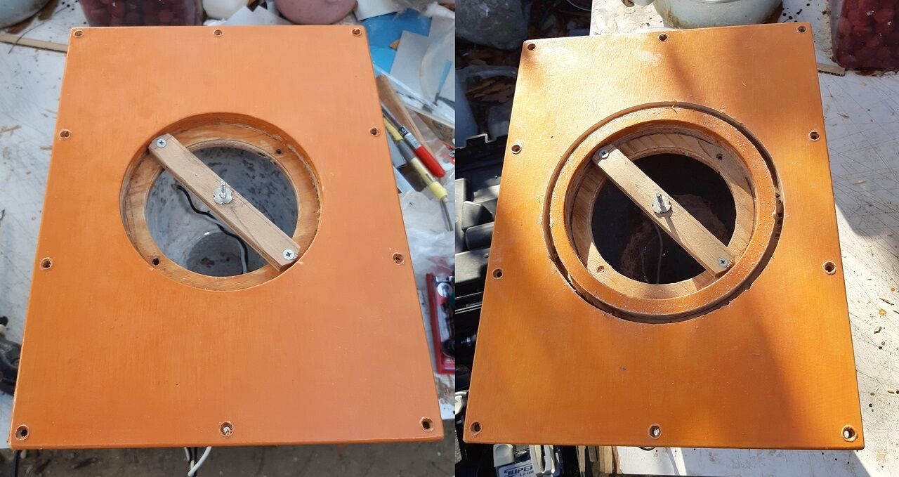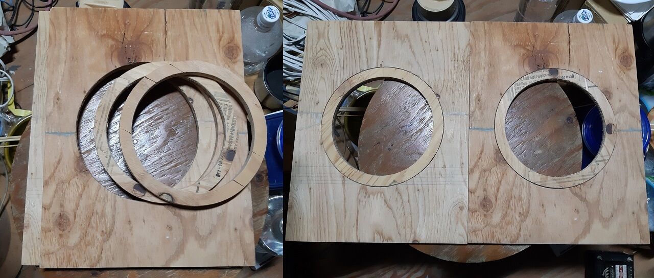 サブ・バッフルが収まる開口は∮159程度です。今回使う20㎝ユニットの開口に合わせてトリマーで加工します。先ず、トリマーを使うための確りした中心点を決めないと加工できません。そこで、次の写真の左の様にビス穴を利用して板片を固定し、次にバッフルの中心点にビス穴を開口し鬼目ナットとビスで板を確り挟み込みます。これが出来れば作業は終わった様なもので、所望の半径でビットを少しづつ深くしていけば完了です。(写真の右側参照)
