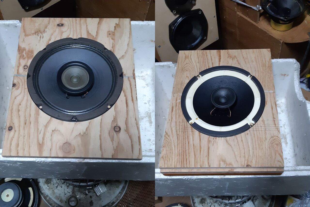 ①は手元にないので当日のお楽しみです。②はFUJIKEN FE-208(409-8Eに酷似)でエッジは人見さんにセーム皮に交換して貰い、更にコーン紙に特殊塗料をコーティングし硬化させ約6ヶ月位エージングさせた物。写真左側は、EV409-8Eです。