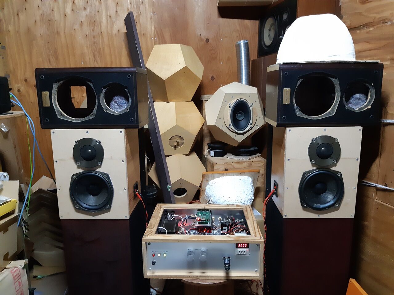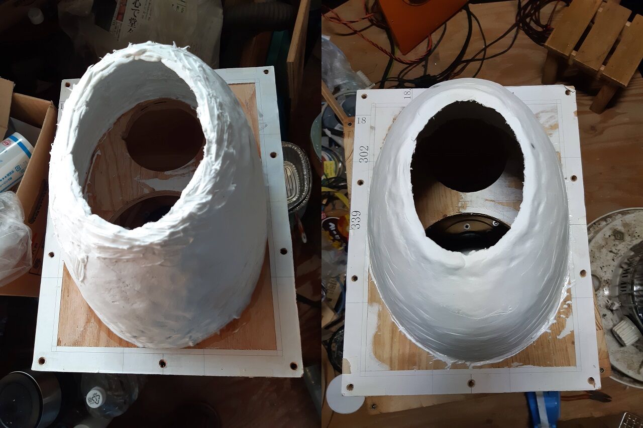 当日使う6面体BOX(半楕円中空体を内蔵)に宛がってみると色んなアイディアが出てきました。ただ、時間が限られていることから今日作ったバッフル類は使わず手持ちの二種類のバッフルを加工することにします。EV409-8Eは、旨く行けば京都で開催予定のオフ会で披露しようかと思っています。