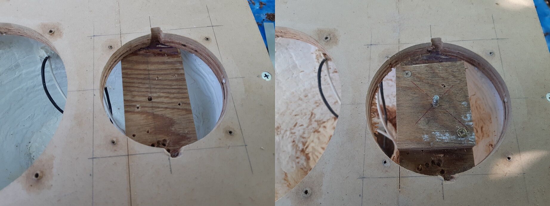 次にサブバッフルになる訳ですが写真を撮り忘れたので経過写真は有りません。(実際は、三つのパーツをそれぞれトリマーで切り出し接着した物になります。)バッフルに取り付けた写真を示します。両方と問題ありません。